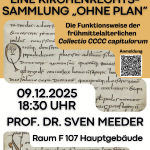 Vortrag „Eine Kirchenrechtssammlung ‚ohne Plan‘ – Die Funktionsweise der frühmittelalterlichen Collectio CCCC capitulorum“Abendvortrag im Rahmen der Rechtshistorischen Vortragsreihe von Prof. Dr. Sven Meeder (Radboud Universität Nijmegen)