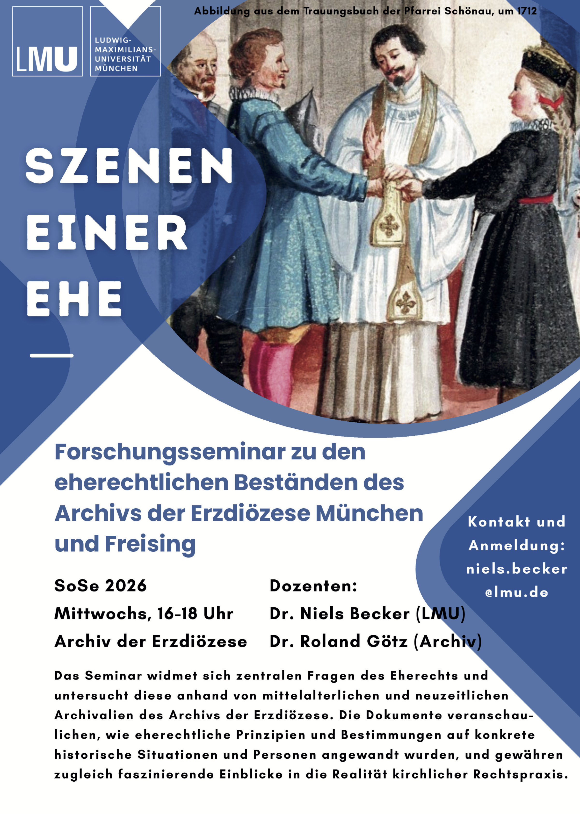 Das Seminar, das von Dr. Niels Becker und dem stellvertretenden Direktor des Diözesanarchivs, Dr. Roland Götz, geleitet wird, widmet sich zentralen Aspekten des kirchlichen Eherechts und schöpft dabei aus den reichen Beständen des erzbischöflichen Archivs. Anhand verschiedener Archivalien aus Mittelalter und Neuzeit werden Themen wie Eheschließung, Ehehindernisse und Ehedispens erarbeitet und diskutiert. Das Seminar veranschaulicht, wie eherechtliche Prinzipien und Bestimmungen auf konkrete historische Situationen und Personen angewandt wurden, und gewährt zugleich faszinierende Einblicke in die Realitäten kirchlicher Rechtspraxis in früheren Jahrhunderten. Die Veranstaltung verfolgt einen objektgeschichtlichen Ansatz, d.h. im Mittelpunkt stehen die Arbeit an und die Auseinandersetzung mit den deutsch- und lateinischsprachigen Archivalien, deren Bedeutung durch die Anwendung grundwissenschaftlicher, philologischer und rechtshistorischer Methoden erhellt werden soll. Veranstaltungsort ist der Lesesaal des Archivs des Erzbistums München und Freising statt, wo die zu bearbeitenden Dokumente aufbewahrt werden.