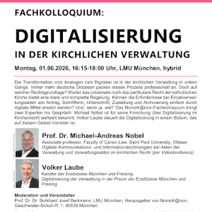 Die Transformation vom Analogen zum Digitalen ist in der kirchlichen Verwaltung in vollem Gange. Immer mehr deutsche Diözesen packen diesen Prozess professionell an. Doch auf welcher Rechtsgrundlage? Weder das universale noch das partikulare Recht der katholischen Kirche bietet eine klare und komplette Regelung. Können die Erfordernisse bei Einzelverwaltungsakten wie Antrag, Schriftform, Unterschrift, Zustellung und Archivierung einfach durch digitale Mittel ersetzt werden? Und, wenn ja, wie? Das NomoK@non-Fachkolloquium bringt zwei Experten ins Gespräch: Michael Nobel ist für seine Forschung über Digitalisierung im Kirchenrecht weltweit bekannt; Volker Laube steuert die Digitalisierung in einem Bistum, das auf diesem Gebiet Vorreiter ist.