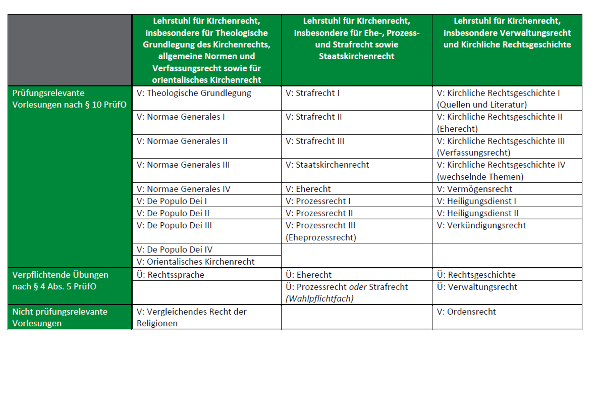 Nein, es ist nur erforderlich, Leistungsnachweise „aus verschiedenen kanonistischen Fachgebieten“ (§ 4 Abs. 2 Nr. 5 PrüfO) vorzuweisen. Grundsätzlich empfiehlt es sich natürlich dennoch, Seminare bei allen drei Professoren zu besuchen. Wichtig ist, zu beachten, dass nur von den Professoren des KMSK geleitete Seminare die Anforderungen erfüllen, Übungen und Seminare der wissenschaftlichen Mitarbeiter/innen jedoch nicht anrechenbar sind.
